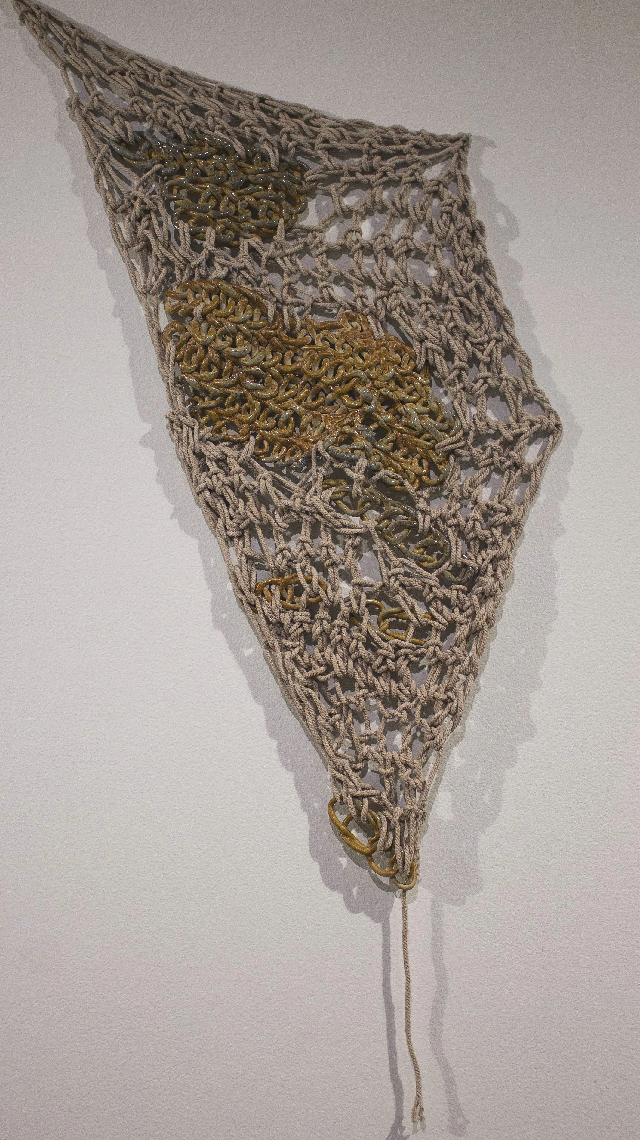 Tenuous Connections hangs on the wall like a crocheted blanket, broken into pieces and reconnected. The interplay of fragile crocheted ceramic coils and the fiber holding it together, beckons viewers to contemplate the profound implications of the tenuous yet precious connections we have to each other through craft and fiber traditions. Creating visual suspense through tension on the faux strength of the ceramic stitches to demonstrate the critical reliance of each link on the others; the need to create lasting connections, as the strength of the whole depends on the connection between the individuals.