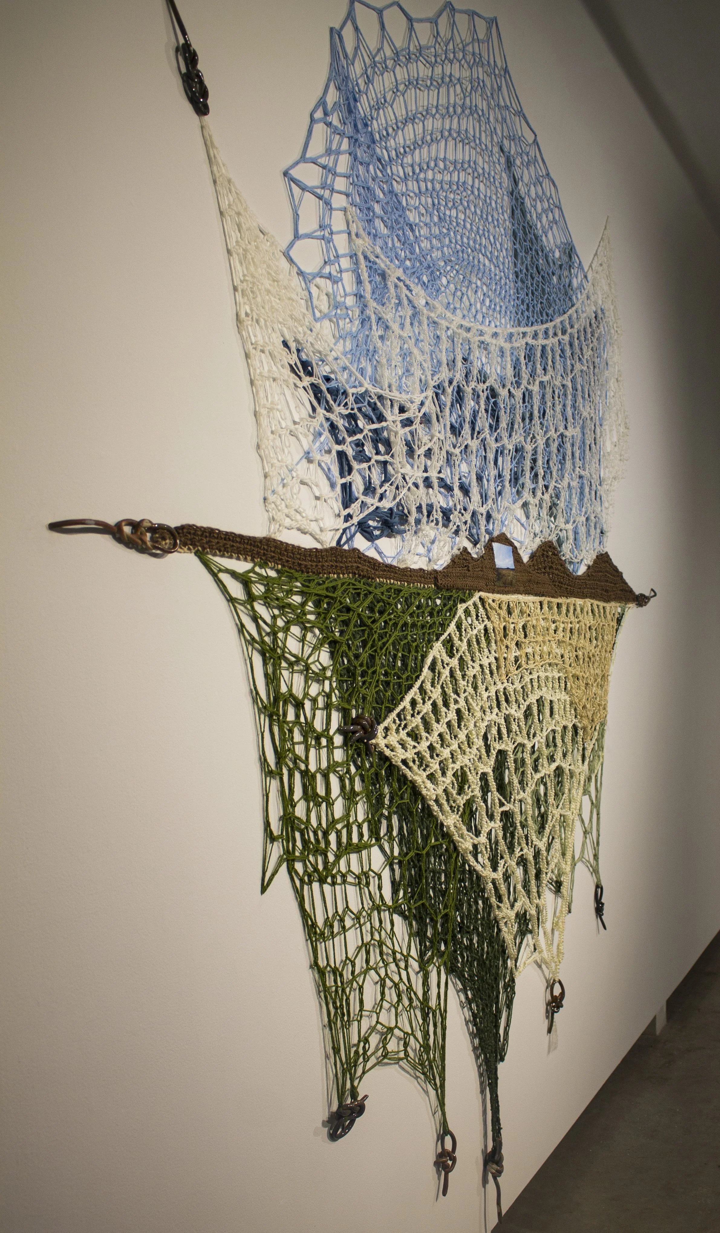 The second perspective of 42160 shows more detail of the layers of loose crochet that create depth and texture. The ceramic pieces anchor the fiber and create tension throughout the fabric. The ceramic pieces were soda-fired, giving them a mixed oxidized earthy and green glassy finish. The ceramic pieces crocheted in, create tension throughout the fabric. This tapestry was influenced by earlier works of Amanda Salov and made increasingly personal through materials that connect to the comfort of my home and cherished familial craft traditions.